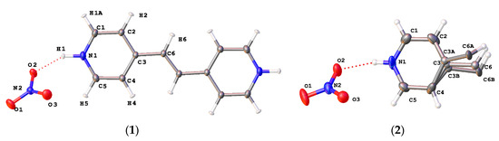 Independent atom model (IAM) refinement. Crystal structures were solved using the SHELXT [24] program and refined with SHELXL [25] using OLEX2 (OlexSys Ltd., Durham, UK) [26] software using a full-matrix least-square procedure based on F2. The H(N), H2 and H4 atoms were located on difference Fourier maps, positions of other H(C) atoms were calculated. All hydrogen atoms were refined isotropically with Uiso(H) = 1.2Ueq(X). The position of the H1(N1) atom was freely refined, and positions of H2(C2) and H4(C4) atoms in salt 2 were refined using DFIX instruction. The structure of 1 was the same as the one described elsewhere [21,22]. After irradiation, the space group of the single crystal remained unchanged, however, crystal parameters similar with 1 were observed for I 2/a space group settings. We used this space group (Table 1) to simplify comparison of unit cells of 1 and 2. Besides, after irradiation the residual density peaks indicated presence of the C6 atom disordered over three positions corresponding to H2bpe2+ and H4tpcb4+ cations. Free refinement of major and minor position occupancies gives the ratio H2bpe2+:H4tpcb4+ = 0.87:0.13, but in the final refinement corresponding values were fixed at 0.9:0.1. Positions of the C3 atoms were also disordered using the same occupancies. Atoms C3A, C3B and C3 were refined in isotropic approximation. EADP instructions were used for refinement of disordered carbon atoms. Experimental details and convergence factors are listed in Table 1, asymmetric units of 1 and 2 are depicted on Figure 1.