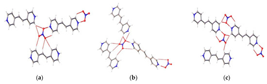 A more rough approximation of intermolecular and interatomic bonding presence can be carried out within the Voronoi tessellation. Within this approach an atom in crystal space is approximated by its Voronoi polyhedron (a convex polyhedron formed by points of crystal space that are closer to this atom than to any other), and a molecular Voronoi polyhedron is constructed as a sum of atomic Voronoi polyhedra [47,48,49,50]. The volumes of the anion and cation obtained within the Voronoi and the QTAIM approaches (respectively, 52.5 and 44.8 Å3 for NO3−, 232.4 and 214.0 Å3 for H2bpe2+) were very close that confirms that the Voronoi polyhedron represents well atomic and molecular domains.