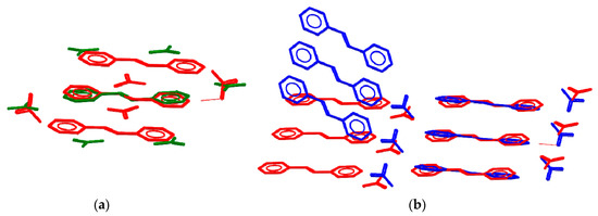The role of other interactions and differences in crystal packing of the polymorphs can be visualized using the Crystal Packing Similarity tool of the Mercury package [35] as described in Refs. [36,37]. On Figure 3 the triclinic (green) and the monoclinic P (blue) polymorphs were compared with the monoclinic C (red) one. It is clearly seen that both monoclinic polymorphs form stacks of cations via π…π interactions (Figure 3b), but these stacks are packed in different ways due to various sets of C–H…O and N–H…O bonds between cations and anions. However, one can expect that the monoclinic P polymorph should be photo-sensitive due to similar disposition of olefin fragments with that in the photo-reactive monoclinic C polymorph. In the triclinic polymorph, the stacks of cations are separated by anions, thus, it should be photoinert.