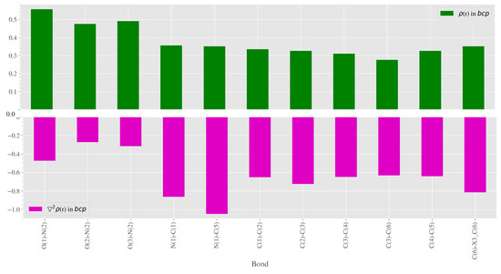 The values of electron density (upper diagram) and its Laplacian (lower diagram) at bond critical points (bcps) in 1 (atomic units). Symmetry code X3: 1 − x, −y, 1 − z.