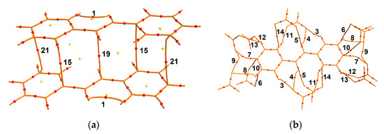 - Peresypkina, E.V.; Blatov, V.A. Topology of molecular packings in organic crystals. Acta Crystallogr. Sect. B 2000, 56, 1035–1045. [Google Scholar] [CrossRef]