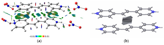 Thus, we found three bcps between olefin groups of neighboring molecules that prove that a bonding path could act as a channel of charge redistribution in the course of a photoreaction. Although there was no four-membered cycle formed by bond paths, it should be mentioned that bond paths corresponding to weak interactions, especially in the region of flat electron density distribution, should be regarded as a secondary phenomenon towards intermolecular bonding in accord with Dunitz and Gavezzotti’s [41] suggestion. Other methods describing intermolecular interactions in terms of common intermolecular surface can be useful in this case. For example, application of the NCI (non-covalent interaction) method [42,43] based on the dimensionless RDG (reduced density gradient) function related to the magnitude of λ2 eigenvalue (signλ2ρ) allows us to distinguish attractive and repulsive, weak and strong interactions [44,45,46]. Three-dimensional isosurfaces of RDG function in the regions of these interactions colored according to the sign of λ2 multiplied by ρ(r) visualize these differences. As a rule, the maxima for rather strong intermolecular interactions like classic hydrogen bonds (O–H…O or N–H…O) are small and they have a discoidal shape. The sign of λ2 is mainly negative that is an indicative for attractive nature of classic hydrogen bonds. On the contrary, the maxima for weak H…H interactions are characterized by a rather large area and they had no definite shape. On Figure 7, the 3D isosurface of RDG for stacking cations is depicted. The interactions of π-systems (Ph and ethylene bridges) according to the sign of λ2 had both an attractive and repulsive character. The area of the latter interaction was the largest one, the sign of λ2 changed from slightly positive to negative. The latter fact is indicative for the fact that all carbon atoms participate in cation–cation bonding rather than several atoms shown on the molecular graph (Figure 6).