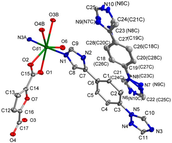 The single crystal data of [Cd(L)(frda)(H2O)]·0.5L·H2O (1) suitable for analysis were selected and collected on a Rikaku XtaLAB Synergy diffractometer. The structure was solved and refined using the OLEX2 program suite, equipped with the ShelXT and ShelXL program [30]. The crystallographic refine data are displayed in Table 1.