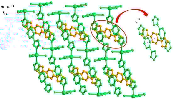 X-ray crystallographic analysis shows that CP 1 crystallizes in the triclinic P1− space group (Table 1), and the asymmetric unit of 1 contains one unique Cd(II) atom, one coordinated L organic ligand, one deprotonated frda2- molecule, one coordinated water molecule, a half of uncoordinated L ligand, and one lattice water molecule. The unsymmetrical polyazaheteroaromatic ligand of N2 and C8, N5 and C7, and N4 and C10 atoms can be defined according to their different atomic displacement parameters. The lattice of L lies an inversion center. The center Cd(II) atom is linked by two nitrogen atoms (N1 and N3A) from two different L ligands and four oxygen atoms (O1, O2, and O3B, O4B) from two pairs of carboxyl groups and one oxygen atom (O6) from the coordinated water ligand, thereby forming a seven-coordinated coordination geometry with a N2O5 donor set (Figure 1). The Cd–O bond lengths varied from 2.346(2) to 2.5866(18) Å and the Cd–N ones were 2.281(2) and 2.288(2) Å (Table 2), and the coordination angles were around the Cd1 range from 52.90(6) to 175.41(7)°. The L ligands adopt linear bidentate bridging mode to combine Cd(II) ions to form one-dimensional (1D) chains. The adjacent 1D chains are connected by frda2- ligands to form a two-dimensional (2D) layer (Figure 2). From a topological perspective, the 2D layers can be simplified to 4-connected sql nets with point symbol (44·62). The parallel 2D layers are stacked in an AAA···mode, and the infinite 1D channels are created along the a-axis, where the uncoordinated L molecules are embedded in the void of 1 (Figure 3). The solvent-accessible volume of these channels without considering guest L molecules was estimated to be 387.8 A3, approximately 32.5% of the total crystal volume of 1194.1 A3, calculated with the PLATON program [31]. It is noteworthy that the nitrogen and oxygen atoms from multi-N donor or carboxyl groups, can easily be employed as acceptors of hydrogen bonding, and as a return, the weak interaction can easily benefit the formation of a supramolecular polymer. In the packing diagram, rich hydrogen bonding interaction are found in CP 1, and the C−H···O, O−H···O hydrogen bonding including (C(2)···O(2)c 3.142(3) Å, C(2)–H(2)···O(2) 148°; C(10)···O(2)c 3.101(4) Å, C(10)–H(10)···O(2) 155°; C(11)···O(6) 3.410(4) Å, C(11)–H(11)···O(6) 151°; C(6)···O(6) 2.738(3) Å, C(6)–H(6B)···O(6) 169°; O(6)···O(5) 2.872(4) Å, O(6)–H(6A)···O(5) 167°; C(9)···O(4) 3.086(3) Å, C(9)–H(9)···O(4) 118°) exist among the adjacent 2D layers (Table 3). In addition to the rich hydrogen bonding, classic weak π−π stacking interactions could also be found between the neighboring 2D packing layers. The five-membered furan rings of the frda2- ligands were completely parallel with the centroid−centroid distance of 3.49 Å, indicating the existence of strong π−π stacking interactions [32,33]. On the whole, the weak interactions including the hydrogen bonding and π−π stacking interactions progress adjacent 2D layers into a three-dimensional (3D) supramolecular polymer (Figure 4).