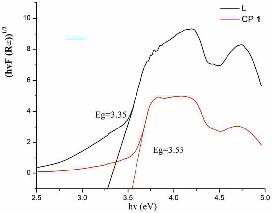 The UV–Vis spectra in the solid-state were investigated for the CP 1 together with the organic compound L (Figure 7). The CP 1 and L molecules showed the same absorption peaks ranging from 275 to 345 nm in the UV region, which belongs to π → π* and n → π* transitions of the ligand. Furthermore, the diffuse reflectance data obtained were transformed into a Kubelka–Munk function to get their band gaps (Eg), which can be employed to evaluate the semiconductivity of the CPs. The values of Eg for 1 and L were estimated as 3.55 and 3.35 ev (Figure 8), which can be determined by the theory of optical absorption for the direct band gap semiconductor: (Ahν)2 = B(hν − Eg) [34], indicating that the as-synthesized crystalline material is an optical semiconductor [35].