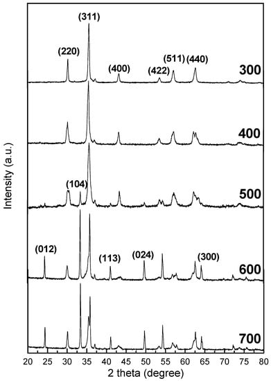 By taking the most outstanding peak which corresponds to the reflection plane (311) for samples calcined at 300 °C, 400 °C. and 500 °C, and the reflection plane (104) for samples calcined at 600 °C and 700 °C, the interplanar spacing dhkl was calculated using Bragg’s equation, which in turn helped to obtain the lattice constant ‘a’ through the equation: