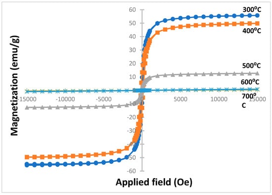 The magnetic properties of the prepared samples were measured through VSM measurements, with an applied maximum applied field of 15 kOe. The resultant magnetic hysteresis is shown in Figure 3. The dependence of the magnetic parameters such as magnetic saturation, Ms and coercivity, Hc, on the calcination temperature was analyzed using this hysteresis loop. The Ms and Hc values for different calcination temperatures are given in Table 2. As the calcination temperature increased from 400 °C to 600 °C, the saturation magnetization showed a significant decrease due to the decrease in the phase content of MnZnFe2O4 (Table 1). It could be observed from Figure 3 that the value of saturation magnetization (Ms) for the MnZnFe2O4 sample calcined at 300 °C was slightly higher than the sample calcined at 400 °C. This may have been due to a high crystallinity and uniform morphologies, which can be observed from Figure 2. The saturation of magnetization decreased tremendously at a calcination temperature of 500 °C, which can be attributed to the development of a ZnFe2O4 phase (Table 1). The hysteresis curves of MnZn Ferrite calcined at 300 °C and 400 °C show ferromagnetic behavior, however at 500 °C it behaved as a weak ferromagnetic and at 600 °C and 700 °C it acted as an antiferromagnetic. This can be attributed to the reduction of the MnZn Ferrite phase and the development of antiferromagnetic Fe2O3 phases in the sample. A coercive field is in the field when M and H change their sign, and one can see from Figure 3 that a small level of coercivity was observed which was assigned to the typical soft ferromagnetic behavior of MnZn Ferrite. The coercivity of MnZnFe2O4 increased with the increasing of the calcination temperature, which may have been due to the irregular large pores on grain boundaries hindering the domain wall motion. It is well known that coercivity is caused by the resistance of domain wall displacement [12].