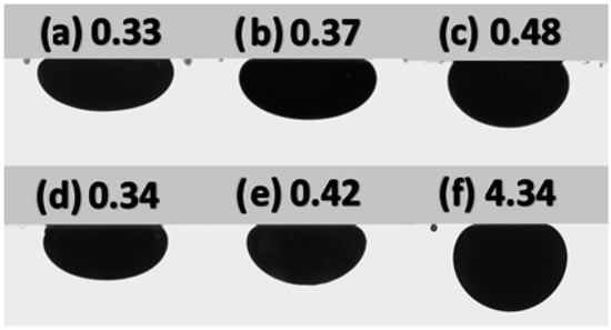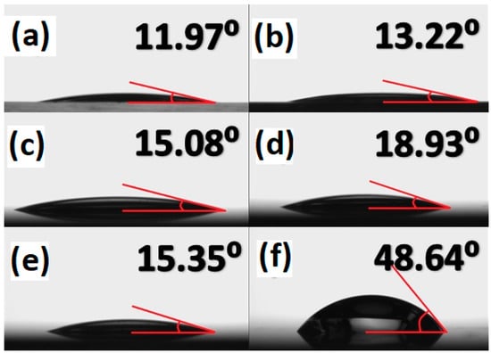 Contact angle measurement for nanofluid with MnZn ferrite nanoparticles calcined at temperature of (a) 300 °C, (b) 400 °C, (c) 500 °C, (d) 600 °C, (e) 700 °C, and (f) without MnZn Ferrite nanoparticles.