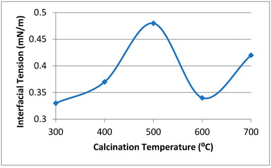 MnZn ferrite calcined at various temperatures in synthetic seawater solution (nanofluid) was tested for its effects on reducing IFT between nanofluid and crude oil at room temperature. Figure 4 shows the IFT measurement for oil/nanofluids with MnZn Ferrite calcined at various temperatures and oil/nanofluid without MnZn ferrite. Nanofluid with MnZn ferrite calcined at 300 °C had the lowest IFT, whereas at 500 °C it had the highest IFT value. The IFT value increased from 0.33 mN/m to 0.48 mN/m when the calcination temperature increased from 300 °C to 400 °C. The increase in IFT value was attributed to the increase in the crystallite size. The IFT result showed an increasing trend with a calcination temperature of up to 500 °C, followed by a decreasing trend at 600 °C and then an increasing trend again at 700 °C (Figure 5). This behavior could be attributed to the fluctuation in magnetization of MnZn Ferrite NPs (Table 2) due to the decrease in the ferromagnetic MnZn Ferrite phase and the development of an antiferromagnetic Fe2O3 phase in the sample (Figure 3), suggesting that the magnetic properties of MnZn Ferrite NPs contributes to the IFT alteration, which needs further study. The magnetic polarization of NPs causes the oil drops to deform, which increased the surface area and consequently altered the IFT [19]. The IFT value did not show significant changes for different calcination temperatures. However, MnZn nanofluid gave interesting results compared to the previous report [12,13], while the nanofluid without MnZn ferrite NPs had an IFT value of 4.34 mN/m (Figure 4f). This result indicates that MnZn nanofluids have the potential to improve oil recovery by reducing IFT.
