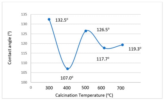 Reservoir rock wettability has a massive effect on interface movement and is associated with the displacement of oil through porous media. Oil recovery increases significantly when the wettability of the rock changes from oil-wet to water-wet. Contact angle measurement is an essential enhancing test for wettability alteration study [14,15]. The MnZn ferrite nanofluids were separately dropped on a glass slide to find their contact angle values. The variation of contact angles on the MnZn Ferrite’s calcination temperature is shown in Figure 6. It was observed that the contact angle increases with an increase in the calcination temperature. The increase in contact angle is attributed to the increase in crystallite size and irregular particles in the sample. The findings indicate that the increase of water wetness was due to the decrease in the crystallite size and increases in the regularity of the particle size. In addition, the contact angle of nanofluid without MnZn Ferrite nanoparticles was 48.64°. This value was decreased to a range of 11.97° to 18.93° by introducing an MnZn ferrite nanoparticle in nanofluid. The largest reduction of the contact angle was obtained by MnZn Ferrite calcined at 300 °C, while 600 °C showed the lowest reduction to a value of 18.93°. Figure 7 shows the measurement of the solid-nanofluid-oil three-phase contact angle. It is observed that the contact angle of oil/MnZn Ferrite nanofluid decreased from 132.5° to 107.0° when the calcination temperature increased from 300 °C to 400 °C. The contact angle of oil/nanofluid with MnZn ferrite calcined at 300 °C has the highest contact angle value, whereas at 400 °C it has the lowest contact angle value. Meanwhile, the contact angle of oil/nanofluid with MnZn ferrite calcined at 500 °C, 600 °C, and 700 °C exhibit similar trends to those in IFT measurement (Figure 5).