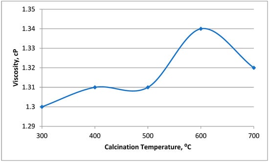 The viscosity of MnZn Ferrite nanofluids was measured using a Brookfield rheometer DV3T modeled LVTJ0 at 25 °C. The viscosity of these nanofluids was measured with a shear rate from 0 to 122 s−1 and a shear stress of 0.16 Pa. The values reported were the average of the three measurements. Figure 8 shows the effect of calcination temperature on the viscosity of MnZn Nanofluids. It can be seen from Figure 8 that the viscosity increases with the increase in calcination temperature (300 °C to 600 °C). However, it was observed that there was an anomalous reduction of viscosity at temperatures of 500 °C and 700 °C. A similar trend was observed in Figure 2. Therefore, it is suspected that the particles size of MnZn Ferrite was the main factor that contributed to the variation of viscosity. Overall, the viscosity results do not show significant changes with the calcination temperature. It has been reported that a reduction in the oil-water viscosity ratio can improve the oil recovery process because of the formation of oil-water emulsion [20].