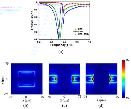 Furthermore, the induced electric field distributions of the three arrays at the resonant frequency are exhibited in Figure 2b–d. For the CRR structure, the electric field is mainly concentrated in the two horizontal arms. For the SSRs structure, only two SRRs (aligned with CRR in a horizontal direction) are excited by the incident terahertz wave, and the electric field is mainly focused around the gaps of the two excited SRRs. For the combined CRR and SRRs structure (i.e., the proposed PIT metamaterial), the enhancement of the electric field concentrates around the split gaps of the two previously excited SRRs, while the electric field distribution at the CRR is strongly suppressed because of the electromagnetic coupling effect, which indicate the destructive interference between the bright and dark modes.