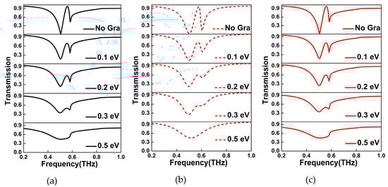 Next, single-layer graphene, a two-dimensional flat sheet, was integrated into the unit cell to realize a tunable PIT effect. The transmission spectra corresponding to the unit cell without and with single-layer graphene are plotted in Figure 3a. Without a graphene layer, there is a typical transparent peak with a transmission amplitude of 0.97 at 0.56 THz. In the presence of a graphene layer under the metal structure, the transmission amplitude of the PIT window is gradually attenuated with the increase of Fermi energy, which provides a way to control the PIT response. For example, the transmission amplitude of the PIT peak changes from 0.69 with to 0.49 with without a noteworthy frequency shift. With , the transparent window is eliminated completely, and only a resonance notch remains at 0.52 THz in the transmission spectra. Finally, the transmission amplitude of the PIT window experiences an on-to-off process by merely shifting Fermi energy without reconstructing the metamaterial structure, which is more desirable for practical applications.