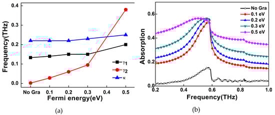 The resultant transmission spectra through the metal–graphene PIT metamaterial is calculated based on the classical coupled two-particle model, as shown in Figure 3b. The overall qualitative agreement between the numerical simulation and calculation results is excellent, validating the rationality of the analytical model. In the process of fitting the transmission spectra, we let A = 40, B = 1, considering the weak response of the dark resonator to the incident field in the PIT device. As a result, other corresponding fitting parameters with different Fermi energies are plotted in Figure 4a. Clearly, and maintain stable values as the Fermi energy changes; however, shows a drastic, almost linear increase from THz for the absence of graphene to THz for the case with . This indicates that the damping rate of dark SRRs, being an important parameter accounting for the tunable PIT effect, is evidently enhanced with a higher Fermi energy. As the losses in the dark resonator are significantly increased, the LC resonance intensity is evidently decreased. In the PIT structure, the graphene layer with high conductivity, which acts as a channel of charge, shorts the split gaps of the dark SRRs. As the graphene Fermi energy increases, the strong shorting effect of graphene with high conductivity on the capacitive split gaps weakens the surface resonance current of the dark resonator, reducing its LC resonance intensity and effectively suppressing the destructive interference between the bright and dark resonators. With , the dark mode resonance intensity is too weak to maintain the appearance of PIT resonance. The tunable response is attributed to the dampening of the dark resonator through the conductive graphene layer. Despite the simplicity of the coupled two-particle model, the fitting results predict the function of the graphene layer in the device structure and can be used to further optimize device performance.