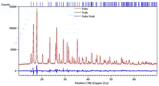 A stock solution of Cu(NO3)2∙3H2O with a concentration of 1 mole per liter was prepared in water. A second stock solution of SeO2 dissolved in water was prepared separately with also a 1 mole/liter concentration. An agar gel of 1.5% in weight was prepared containing Cu(NO3)2∙3H2O solution. Prior to the gel formation, the pH of the solution was adjusted to pH = 2 using concentrated HNO3 acid. Once the gel was settled, 5 mL of the SeO2 stock solution was poured on top of the gel for diffusion. After a few days, single crystals of CuSeO3∙2H2O started to appear and were handpicked for a single crystal diffraction experiment. The nature and the purity of the as-grown was confirmed by the Rietveld refinement of a powder X-ray diffraction pattern acquired using a diffractometer from PANalytical (PaNalytical, Almelo, The Netherlands). The data were collected at room temperature (and pressure) on a fine powder obtained from crushed single crystals using a Cu Kα wavelength. The collected pattern of the as-synthetized sample and the corresponding Rietveld refinement are shown in Figure 2 together with the residuals. The refinement was carried out using the HighScore suite (HighScore Plus, PANalytical, Almelo, The Netherlands) [14]. All of the observed peaks can be accounted for by the known crystal structure [5], which leads to small residuals. The resulting cell parameters were a = 6.6719(2) Å, b = 7.3710(2) Å, and c = 9.1718(2) Å.