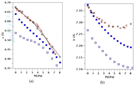 For the pressure–dependence of the c-axis, we observe a nearly linear pressure evolution, with experiments and calculations in qualitative agreement. For the a- and b-axes, a nonlinear pressure dependence has been found. In particular, in the a-axis, there is a slope change observed at a critical pressure of around 3.5 GPa in run 1 and at 4 GPa in the second experiment. This fact is highlighted by solid lines in Figure 3, which represent the pressure dependence in the a-axis below and above the critical pressure. Calculations show a slightly different pressure behavior of the a-axis but also found a kink at 4 GPa. On the other hand, in the b-axis, we found a decrease with pressure up to 4.4 GPa where a minimum value is reached, and, beyond this pressure, this unit–cell parameter increases with pressure. Again, calculations showed a qualitative similar behavior but with the minimum close to 8 GPa. The above described changes are typical of pressure-driven isostructural phase transitions [29]. Since changes were observed at 3.5 and 4.4 GPa in the different axes, we estimate the transition pressure to be 4.0(5) GPa. Interestingly, the transition will cause a collapse of the empty cavities present in the structure of chalcomenite (see Figure 1). This collapse will favor a faster decrease of the a-axis after the transition and the expansion of the b-axis, as we found in our experiments.