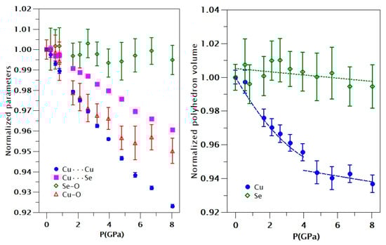 (Left) Pressure dependence of Cu···Cu, Cu-···Se, Se-O, and Cu-O interatomic distances. Error bars for Cu···Cu and Cu-···Se distances are smaller than the symbols. (Right) Pressure dependence of the SeO3 and CuO5 polyhedra.