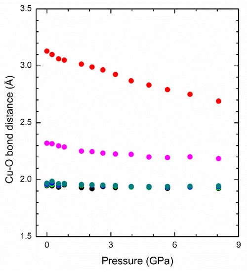 In order to understand the changes that occur in the crystal structure at the phase transition, we have analyzed what happened with the different polyhedral units. Geometrics dependences with pressure have been calculated from run 1. Results from the second run are similar. The results are shown in Figure 4. From these results, we can conclude some general aspects: (1) The triangular pyramid SeO3 is more rigid than the squared pyramid CuO5. This conclusion is consistent with the HP behavior of different selenites [33,34]. As a consequence, the HP behavior of CuO5 will dominate the axial and volume compressibility of the studied compound. (2) The compression of the CuO5 polyhedron undergoes a sudden decrease at 4 GPa, which is the transition pressure. This indicates that the transition is related to a reorganization of oxygen atoms around Cu. In fact, we have noticed that, under compression, there is a sixth oxygen atom, with a Cu-O distance of 3.15 Å at ambient pressure, which rapidly approaches Cu atoms under compression. This is shown in Figure 5 where we present the six shorter Cu-O distances obtained from run 1. Beyond the transition pressure, it can be considered that Cu is no longer five coordinated but six coordinated. In particular, at 4.8 GPa, the length of the sixth Cu-O bond is 2.80 Å: i.e., only 27% larger than the fifth Cu-O bond. This behavior of the Cu-O bonds is very similar to the behavior observed in danburite and parcelsian [31,32], which also undergo isostructural phase transitions under compression. (3) Cu···Cu distances decreases around 8% (along c-axis) and most of the hydrogen bonds have directions parallel to a- and b-axes. We consider that H···H interactions could be in part responsible for the observed phase transition. Below 4 GPa, there are two H···H bond distances, which are mainly oriented along the b-axis, decreasing very rapidly with pressure. The distance is between hydrogen atoms, which belong to different H2O molecules connected Cu atoms of different CuO5 polyhedra. At ambient pressure, there is an empty cavity in between these two hydrogens (as we described before). However, as under compression, the H···H distance becomes considerably shorter, at some point (transition pressure), the electrostatic repulsion between hydrogens make the H···H distance stop decreasing, impeding the compression along the b-axis (in fact, the expansion of this axis is favored). In particular, we found that the average H···H distance decreases from 2.45 Å at ambient pressure to 2.20 Å at 4 GPa to then start increasing, reaching a value of 2.25 Å at 8 GPa. Thus, the fact that the H···H contact becomes stiff with increasing pressure would make that the crystal prefers to compress along the a-axis instead of the b-axis (as it does below the transition pressure) changing the compressibility of both axes and favoring the structural reorganization associated with the phase transition observed in CuSeO3∙2H2O. In summary, all the evidence described above points towards a purely displacive transition, where the SeO3 groups remain unchanged in their topology, and the formation of an additional Cu-O bond and the changes in H···H interactions modify the mechanical properties of chalcomenite. This transformation mechanism should be confirmed by future studies. In particular, HP neutron studies in deuterated samples could be very useful for studying hydrogen bonds.