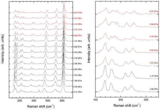 (Left) Raman spectra of chalcomenite measured at different pressures. (Right) Zoom of the low-frequency region to facilitate the identification of pressure-induced changes above 4.37 GPa. Pressures are indicated in the figure.