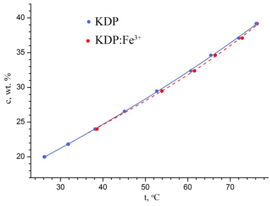 The doping impurity Fe3+ in the form of FeCl3·6H2O (99.8 wt.%) was added in the KDP solution overheated above the saturation temperature. The obtained solution was stirred for several days, then its saturation temperature was determined.