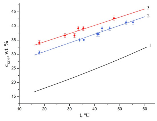 First of all, the KH2PO4 solubility curves in pure water and in water with the addition of 50 ppm Fe3+ were refined. As could be seen (Figure 1), the introduction of Fe3+ in such concentration had almost no effect on the KH2PO4 solubility in water.