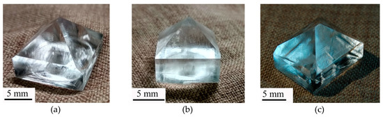 A series of KDP: Fe3+ crystals up to 23 × 22 × 27 mm3 in size were grown. Some crystals can be seen in the Figure 3. They can be divided into three groups depending on the temperature and hydrodynamic growth conditions: grown from fast-cooled solutions at the reversible rotation of crystal; grown from fast-cooled solutions at the one-direction rotation of crystal; grown from slow-cooled solutions at the reversible rotation of crystal. Growing from fast-cooled solutions means that the required supersaturation is achieved at the same time as regeneration of pyramid faces. Growing from slow-cooled solutions means that the temperature decrease average rate is ~0.15 °C/min, and the time to reach the required of supersaturation is 6–8 hours. The idea of crystal growth without forced solution cooling arose because, as was found previously [32], the higher the rate of forced cooling the less the metastable zone width.