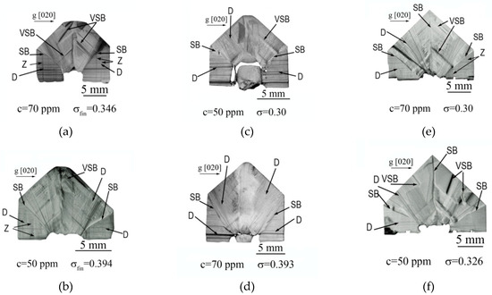X-ray projection topographs of X-cuts of KDP: Fe3+ grown at various conditions. The diffraction vector [020]. D—dislocations, SB—sectorial boundary, VSB—vicinal-sectorial boundary, Z —zonal inhomogeneity. (a,b) Slow solution cooling, reversible stirring; (c,d) fast solution cooling, reversible stirring; (e,f) fast solution cooling, one-directional stirring.