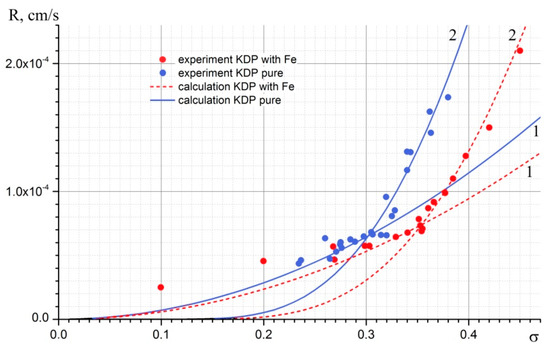 Figure 6 presents experimental data R = f(σ) for pyramid face of KDP crystals grown from pure and Fe-doped aqueous solutions and calculated kinetic curves, which will be discussed later.