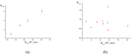 We have determined the values of the trivalent iron (KFe3+) effective distribution coefficients in the {100} growth sectors of KDP crystals grown from high-doped Fe3+ (up to 70 ppm) solutions in a range of supersaturations σ = 0.3–0.4 for the first time. The obtained KFe3+ dependence on normal growth rates of the prism sectors shown in Figure 8a is in good agreement with the dependence obtained by Voronkov for the effective impurity capture coefficient (K) for crystal growth by the dislocation mechanism [44]: