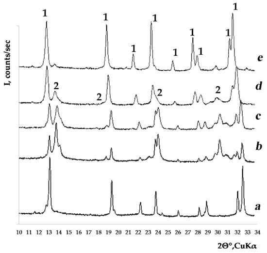 Typical XRD patterns of precipitates (1—weddellite, 2—whewellite), obtained from solutions with different atomic ratio Sr/(Sr + Ca), %: a—0; b—5; c—35; d—70; e—100.