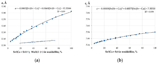 An increase in the unit cell parameters of weddellite, primarily parameter a, also occurs with the increase of zeolite water (Wz) [18,19]. An increase of zeolite water amount in weddellite (from 0.13 to 0.37 apfu), however, leads to an increase in the a parameter by only 0.049 Å [18]. Conversely, the contribution of strontium to the increase of the weddellite parameter a is an order of magnitude greater; the change in parameter a reaches 0.469 Å (Figure 3a). The dependence of unit cell parameters of weddellite on strontium content is not linear and follows a second degree polynomial function (Figure 3). Violation of the linear correlation between the strontium content and the parameter values can be due, first, to the fact that when the Sr/(Sr + Ca) ratio reaches ~40% in weddellite (~60% in solution) Sr2+ ion entry into weddellite slows. Second, it is possible that at this strontium content, the amount of zeolite water in weddellite ceases to increase and a further slower increase in parameters occurs only due to an increase in strontium.