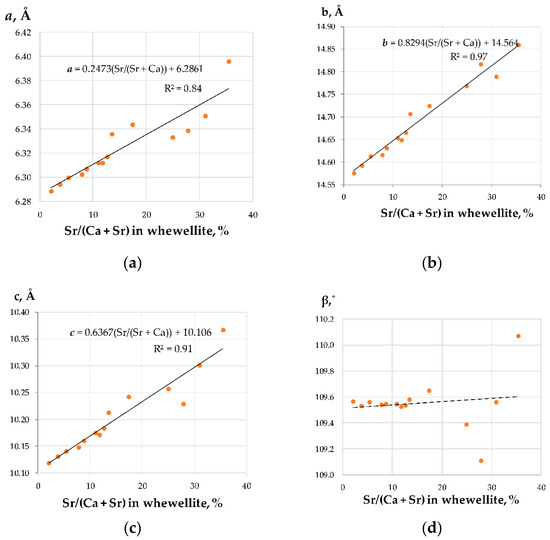 Seen at low strontium concentrations in whewellite (with Sr/(Sr + Ca) ratios in crystals varying from 2.1 to 12.7%; and in solution from 5 to 40%), there is a well-defined linear relationship between the values of linear parameters (a, b, c) and the content of strontium, while the angle β does not change significantly (Figure 4). The fluctuations of both linear parameters and angle β at higher strontium concentrations can be explained by desymmetrization (lowering the symmetry from monoclinic to triclinic), since the crystal structure of strontium oxalate monohydrate (Sr[C2O4]∙H2O) is triclinic [7,24]. Desymmetrization may be associated with reciprocal turns of calcium polyhedra and oxalate groups, associated with the partial ordering of calcium and strontium atoms at the crystallographic sites. To the question of why desymmetrization is not at maximum in the middle of the series, further studies should be made.
