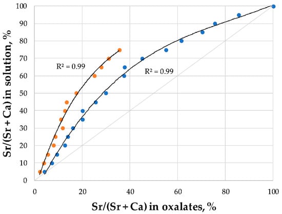 The strontium concentration in oxalate monohydrate and oxalate dihydrate (0 ≤ Sr/(Ca + Sr) ≤ 100%) depends on strontium concentration in the solution following a third degree polynomial function (Figure 5):