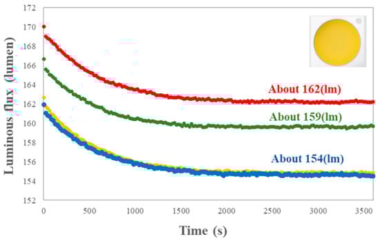 Temporal-dependent luminous flux of the phosphor-converted white LED (pcW-LED).