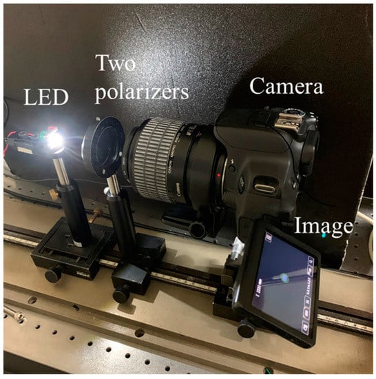 A commercial low-cost pcW-LED with separate dies was used as our light source. The pcW-LED was selected on the basis of its price and other properties, including total flux, exitance, and dimensions. The total flux is a key factor because the illumination distance and visibility of the illuminated target should be clear to a cyclist. Figure 1 illustrates the temporal evolution for the luminous flux, in which the luminous flux reached 150 lm at steady-state operation under a current injection of 400 mA. This light source is more complicated than others used for bicycles, because two separate dies are bonded under a circular phosphor area. As illustrated in Figure 2, we used a camera to capture the image of the pcW-LED when turned on. To prevent overexposure of the camera, two polarizers were used to adjust the incoming light brightness to an appropriate exposure level for the camera. The images are presented in Figure 3, wherein the axis along the two separate dies is called the long axis, and the other axis is called the short axis. Figure 3c illustrates the light distribution contour, which was used to define the weighting factor of each emitting point on the top phosphor surface, where the pcW-LED was regarded as a Lambertian light source [].