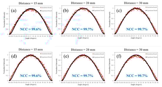 To verify the validity of the pcW-LED optical model, we compared the simulated light patterns with those measured at different distances in the midfield regime [,,], where the farthest distance was 10 times the largest lateral size of the emitting area (30 mm in this case). Figure 4 presents the comparison between the simulated and measured patterns at three distances for two pcW-LED orientations. The normalized cross correlation (NCC) values were consistently >99.5%, which means that the light source model is sufficiently accurate for precise optical design [].