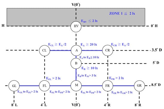 The head lamp was designed to pass the K-mark regulation, which is illustrated in Figure 5, wherein several checkpoints were in the illumination plane 10 m from the head lamp. The first checkpoint is point A, where the illuminance should be ≥20 lux and 1/1.2 of the maximum illuminance of the whole field on the plane. Point A should be located at the same horizontal level as the point of the maximum illuminance. The second checkpoint is located in the dark zone above the cutoff line, where the maximum illuminance should be ≤2 lux. In general, the challenge in optical design is ensuring that the illuminance is ≤2 lux in the dark area. In fact, this is related to the vertical location of the maximum illuminance point. If this location is far lower than the cutoff line, the dark zone would be too close to the cutoff line, and too bright to pass the regulation.