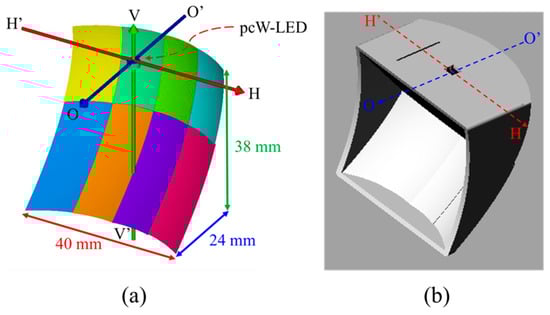 Vehicle head lamps are crucial for traffic lighting to allow high visibility of the driver, pedestrians, and other people on the road. To prevent glare, a head lamp must have a clear borderline [,]. Such a borderline separates the dark and bright zones with minimum contrast, to provide sufficient illumination with less glare. These high-contrast cutoff lines are applicable to cars [,,,,,,], motorcycles [], and even bicycles [,,,]. In general, most designs apply reflection [,,], projection [,,], and refraction [,] to produce a high-contrast cutoff line. By using a combination of various optical principles to design a freeform lens, Chen et al. obtained a highly efficient head lamp to project a high-contrast cutoff line []. Wang et al. adopted reflector-lens sets to project a light pattern for a low-beam head lamp []. Wu et al. used four reflectors and the parameter-optimization method to obtain a low-beam head lamp with an optical efficiency of 79% []. The contrast requirement for the head lamp cutoff line for bicycles is not as strict as that for automotive vehicles, but the head lamp must be lightweight, compact, and inexpensive. Bicycle head lamps have been studied extensively, and most optical designs use a downward reflector or a total internal reflection (TIR) lens [,,,,]. The light source is a solid-state light source (i.e., a light-emitting diode (LED)) because of its advantages, such as compact size, vivid color, fast response, environmental benefits, and long life [,,,,,,,]. A so-called phosphor-converted white LED (pcW-LED) produces a white color by using a phosphor to cover a blue die []. In a pcW-LED, the phosphor layer or volume is a heavy scattering medium with Mie scattering. As blue light passes through the scattering medium, part of the blue light transforms into yellow light to produce white light, while mixing the leakage of blue light []. Therefore, the ratio of the yellow and blue light is critical. A pcW-LED used as a light source in a vehicle head lamp should have good heat dissipation, high color accuracy, and high flux density for illumination [,,]. In general, the pcW-LED operates at 3 W or more, with as small a light source as possible to contain the phosphor in a conformal coating, meaning that the phosphor area is almost equal to the blue die area [,,]. This causes higher exitance for sufficient illuminance, and smaller etendue for a high-contrast cutoff line. The light source is therefore relatively expensive. By contrast, if an LED dies outside of expected specifications, it can be used for pcW-LEDs in low-cost lighting applications, such as a light bulb. Such a pcW-LED is not used as a light source in head lamps, and the phosphor area can be larger than that of the blue dies. This paper presents a design for a K-mark bicycle head lamp by using a low-cost and atypical pcW-LED. In the measurement of the fabricated design, a high-contrast cutoff line was observed but with a yellowish blur pattern. An advanced model was used to describe and solve the color problem.