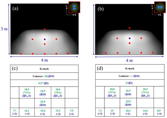 Light patterns in the case of (a) long- and (b) short-axis alignments with the vertical axis. The blue point represents the maximum illuminance, and the red points represent the checkpoints in the regulation. (c,d) Simulated values at the checkpoints on a plane at a distance of 10 m ((c) and (d) correspond to (a) and (b), respectively). Green numbers are simulated values, and blue numbers are requirements at the checkpoints.