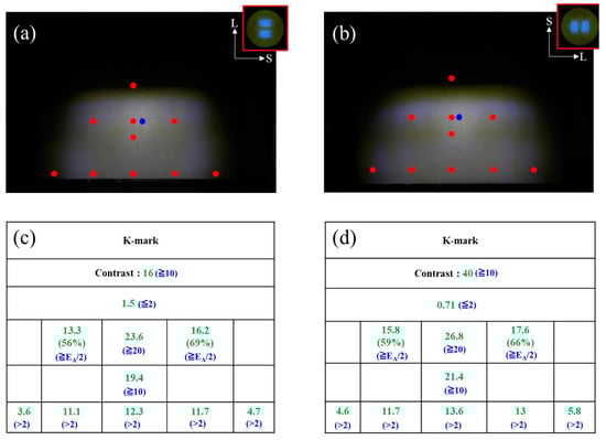 Projected light pattern in the cases of (a) long- and (b) short-axis alignments with the vertical axis. Blue and red points represent maximum illuminance and regulation checkpoints, respectively. (c,d) Measured illuminance at the checkpoints on the plane ((c) and (d) correspond to (a) and (b), respectively).