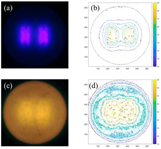 (a) Blue light pattern and (b) the corresponding distribution contour. (c) Yellow light pattern and (d) the corresponding distribution contour.
