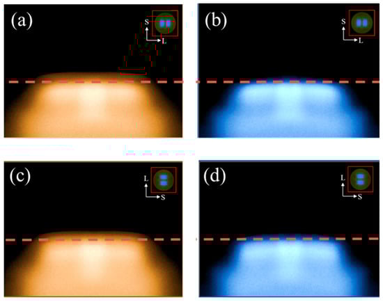 Simulation of the yellow and blue models for the pcW-LED in the cases of (a,b) short- and (c,d) long-axis alignments. Red dashed lines are used to set the same cutoff lines level for the blue and yellow patterns. Figure colors only distinguish blue or yellow.