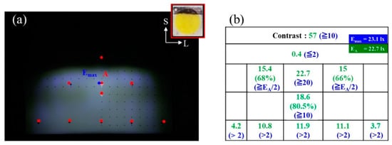 (a) Illumination pattern with reduced phosphor area. (b) Measured illuminance at the checkpoints.