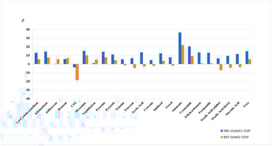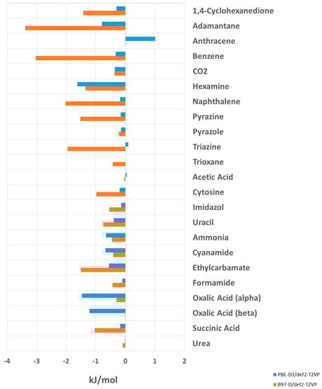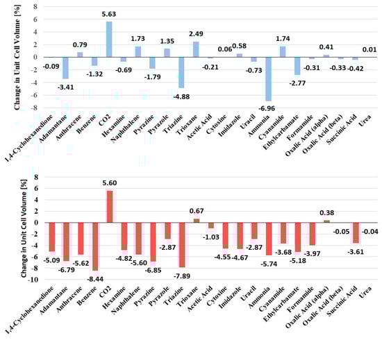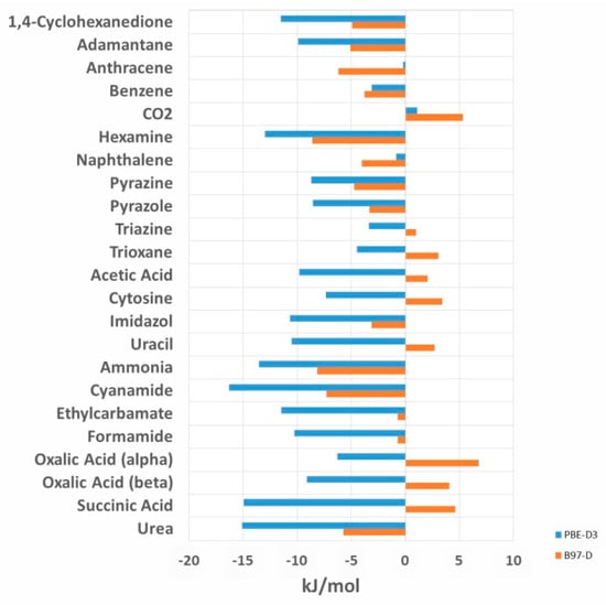 The changes are not systematic and cannot be assigned to a particular type of interaction. The largest decrease in unit cell volume can be seen for ammonia (from 911 a.u.3 to 848 a.u.3, i.e., by −6.96%), and the largest increase in unit cell volume occurs for CO2 (from 1220 a.u.3 to 1268 a.u.3, by +5.63%). These two crystal structures were obtained at very low temperatures, i.e., 160 K for ammonia [53] and 150 K for CO2 [54], and the gaseous systems are a challenge in terms of electronic and solid state structure determination. The overestimation of the CO2 unit cell volume was already noted by [17,19,20], and was shown not to originate from a particular type of dispersion correction method.