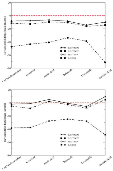 In order to investigate the possible systematic error in our calculations, the convergence of the lattice energies with basis set size was systematically assessed for two representatives of each interaction type with large deviations from experiment (1,4-cyclohexanedion and hexamine for vdW; acetic acid and imidazole for H-bonding; cyanamide and succinic acid for mixed-type interactions; see Figure 3). The low temperature solid forms of gaseous substances such as carbon dioxide and ammonia were not considered because the absolute lattice energies are very small and prone to error from the experimental uncertainty.