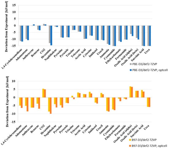 The deviations from the experimental lattice energies are more pronounced and systematic throughout for the B97-D functional. The unit cell optimization doesnot reduce or compensate for the error of the DFT calculations in any of the considered systems. Except for anthracene, for which the lattice energy does not change, all the calculated lattice energies deviate more from the experiment when the unit cell parameters are relaxed. The largest increase of deviation from the experiment is observed for adamantane, i.e., by −3.39 kJ/mol (4.55%), which is an intrinsically challenging system [20] due to the absence of any directed interaction.