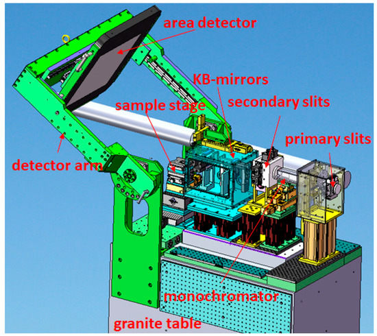 Figure 1). This setup is mounted on a granite table in order to maintain mechanical stability and positioning of the x-ray beam spot on the sample. A fast PerkinElmer area detector (PerkinElmer Optoelectronics) is positioned with a detector arm and, therefore, can be oriented in either transmitted or 90° geometry. The X-ray polychromatic beam from the bending magnet is focused down to 2μm