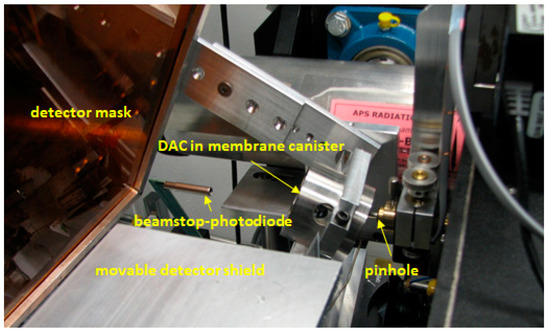 17]. Therefore, a detector mask is not sufficient to eliminate unwanted diffraction spots, and the movable detector shield is used instead. During the experiment, pressure is continuously monitored, and is also measured before and after the transition using an off-line Ruby fluorescence system [