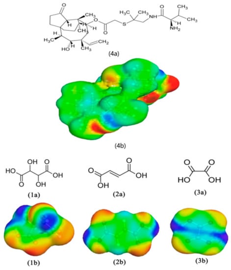 Molecular structure (1a-TAR, 2a-FUM, 3a-OXA, 4a-VLM) and 3D COSMO-surface screening charge densities (1b-TAR, 2b-FUM, 3b-OXA, 4b-VLM). VLM: valnemulin; TAR: tartaric acid; FUM: fumaric acid; OXA: oxalic acid.