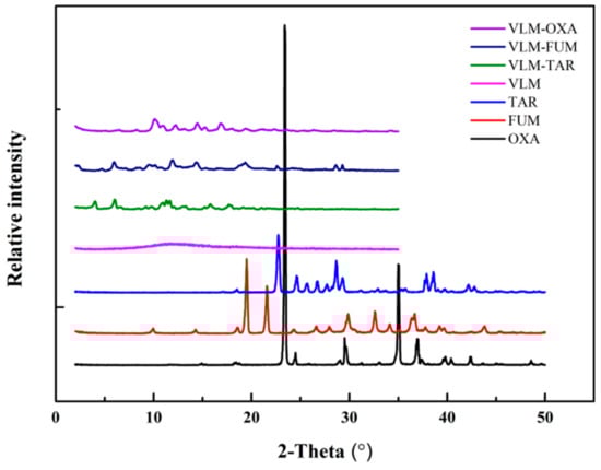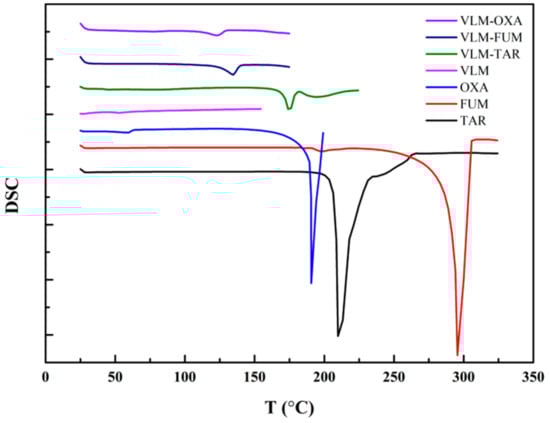The FTIR spectra of VLM, co-formers, and multi-component solids are illustrated in Figures S3–S5. The detailed peaks assignment for the free VLM and each multi-component solid are given in Table 3. VLM showed a peak corresponding to -NH- stretching at 3350 cm−1 (Figure S3). The peak shifted to a higher wavenumber, 3355 cm−1, 3435 cm−1, 3400 cm−1 in the spectra of VLM-TAR, VLM-FUM, and VLM-OXA, respectively. The spectrum of TAR showed -COO- vibration peaks at 761 and 1750 cm−1, which also appeared in the spectra of VLM-TAR multi-component, as shown in the inset of Figure S3. The spectrum of FUM showed a -COO- vibration peak at 650 cm−1, which also appeared in the spectrum of VLM-FUM multi-component, as shown in the inset of Figure S4. The spectrum of OXA showed a -COO- vibration peak at 724 cm−1, which also appeared in the spectrum of VLM-OXA multi-component, as shown in the inset of Figure S5. These results indicated that blue shift really occurred in the -COO- vibration, which means strong stability of multi-component solids due to the hydrogen bonds between -NH- of VLM and -COOH- of co-formers.